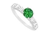 | ✚✚✚ Emerald and Diamond Engagement Ring : 14K White Gold - 0.60 CT TGW Size 10 This engagement ring features a large round prong-set green emerald in the center & is flanked by eight smaller round diamonds on sides. Made in 14K white gold this ring has a total weight (TGW) of 0.60 carat.