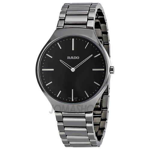 #Platinum-tone ceramic case with a platinum-tone ceramic bracelet. Fixed bezel. Black dial with skeleton hands and stick hour markers. Minute markers around the outer rim. Dial Type: Analog. Swiss quartz movement. Scratch resistant sapphire crystal. Solid case back. Case diameter: 39 mm. Case thickness: 5 mm. Round case shape. Water resistant at 30 meters / 100 feet. Functions: hour, minute. Dress watch style. Watch label: Swiss Made. Rado True Black Dial Platinum-Tone Ceramic Mens Watch R27955152.
