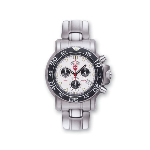 Mens Swiss Military Navy Diver Stnlss Steel Silver Dial Chrono WatchSafety clasp 1 year limited warranty 20atm water resistance 30 min & 12-hr counters 42mm case Chronograph Dial with date Luminous hands Sapphire crystal Screwdown crown Silver dial Stainless steel band Stainless steel buckle Stainless steel case Stainless steel caseback Swiss made Sub-dials Swiss quartz analog Rotating bezel Luminous markers Non Metal Weigth: 1.62 GM This product comes with a FREE Gift Box