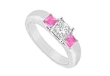 | ✚✚✚ Three Stone Diamond and Pink Sapphire Ring : 14K White Gold - 0.25 CT TGW Size 14.5 Two subtle pink sapphires are prong-set beside a princess-cut diamond. These three stones are a symbol of your past present and the future. Made in 14K white gold this ring has a total gem weight (TGW) of 0.25 ct.