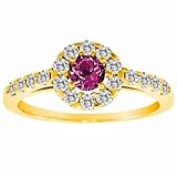 | ✚✚✚ 10K Yellow Gold Halo Round Pink Sapphire and Diamond Ring (1 cttw, H-I, SI) Size 10 1/2 This dazzling sparkling timeless ring is classic and can be used as an engagement ring, anniversary ring, bridal ring, promise ring, proposal ring, fashion ring, wedding ring, cocktail ring and also to represent eternal love between you and that special someone. This 10K Yellow Gold diamond ring is prong set with 18 round white diamonds and 1 round Pink Sapphire gemstone. The center gemstone measures approximately 3.00 mm in diameter. The total carat weight of the entire ring is approximately 1 carat. The diamonds are H-I color and SI-I2 clarity. The ring band measures approximately 1.90 mm wide and 1.50 mm thick.